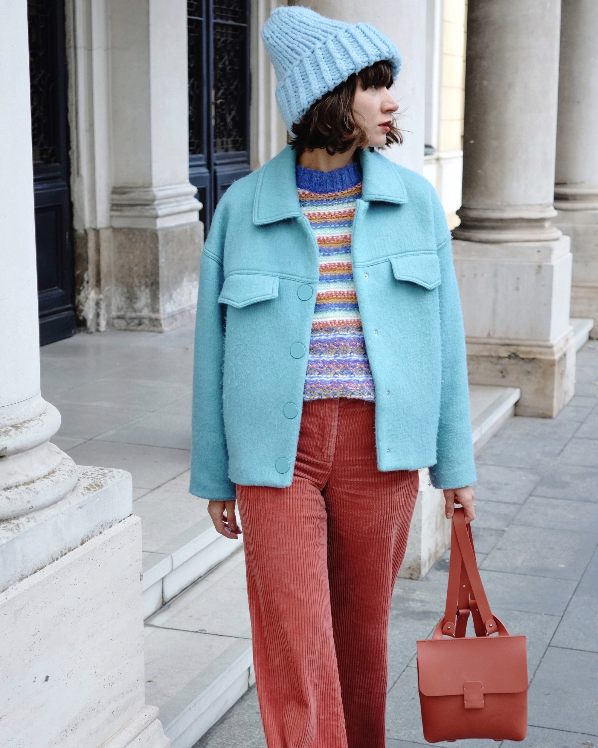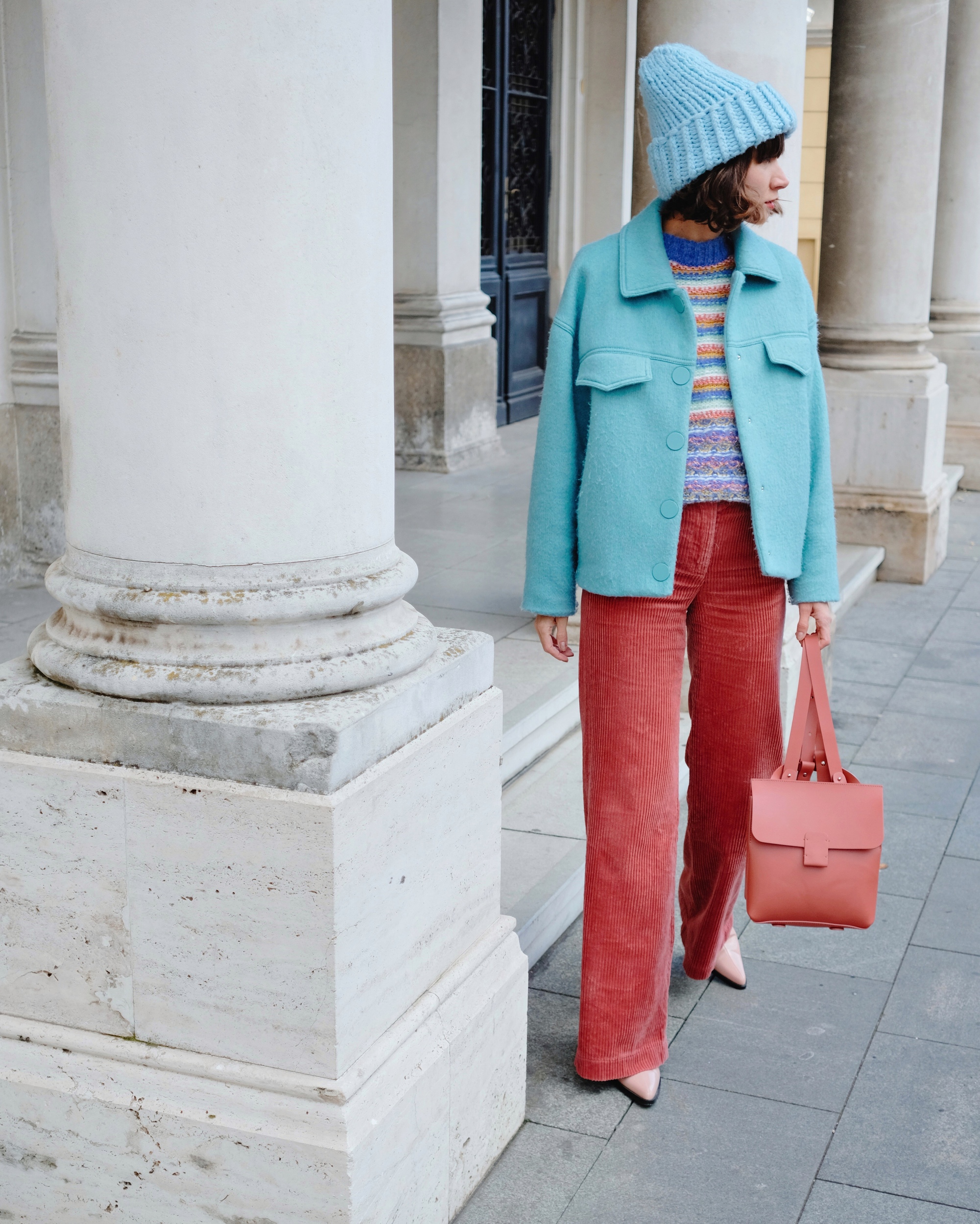 Jutros sam iz ormara izvukla stare samterice koje sam prije dvije zime pronašla na sniženju u New Yorkeru za samo 39 kuna i odlučila sam oko njih izgraditi cijeli outfit. Izbor je pao na pastelne boje koje prkose zimi – omiljenu plavu jaknu i novi pulover koji je genijalna Leandra Medine dizajnirala za Mango, najdraži Little Fashion Paradise ruksak u boji lososa, SOEL by Sonja Lamut kapu i ružičaste kaubojke koje sam prošle zime kupila na sniženju za samo 5 eura.