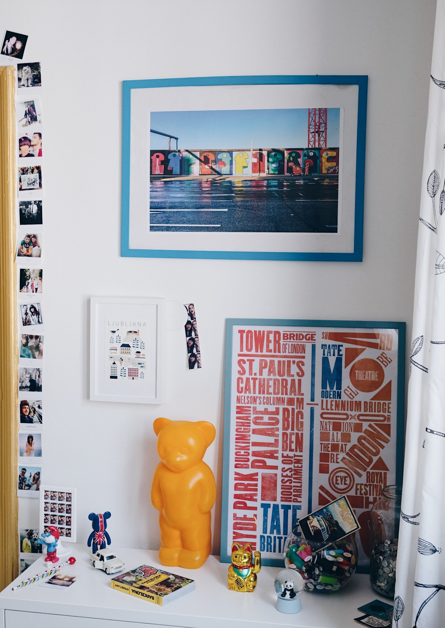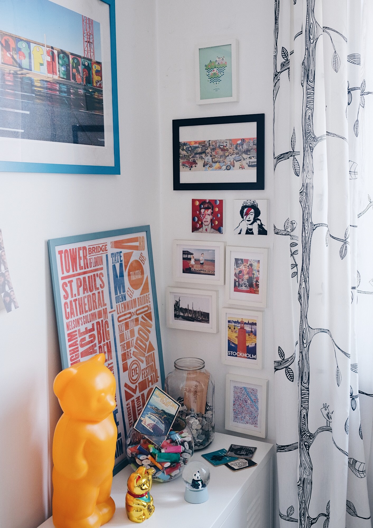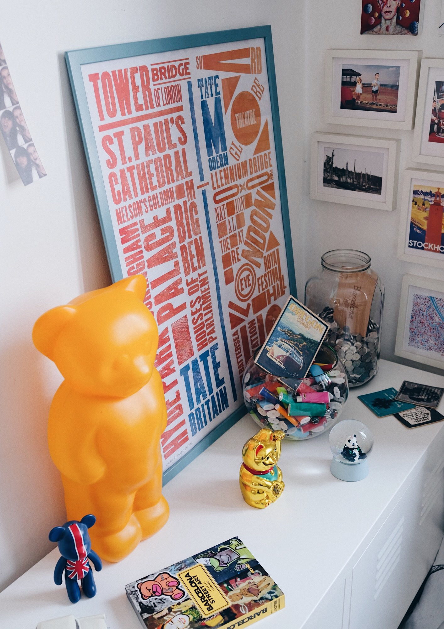 Dečko i ja obožavamo putovati i upoznavati nove gradove, a to je vidljivo i u našoj kući. Cijeli jedan kutak u dnevnoj sobi posvećen je upravo putovanjima na kojima smo bili i sitnim poklonima kojima nas prijatelji razvesele nakon svog putovanja. U posljednjih desetak godina tu su se nakupili plakati iz Londona i Berlina, razglednice iz Barcelone, Stockholma, Bruxellesa, Budimpešte, Beča i Vancouvera… Posebno mjesto našla je i medo lampa koju sam upecala prošle godine u Beču na jednom simpatičnom buvljaku. U tom trenutku se činila užasno nepraktična i nespretna za nositi okolo, no danas me podsjeća na divan vikend koji sam provela u glavnom gradu Austrije. Kad putujem tražim neobične suvenire koji će se uklopiti u naš kutak i obogatiti ga zanimljivim izgledom i zgodnom anegdotom. Kutak je u međuvremenu postao premali za sve sitnice s putovanja pa smo još jedan zid posvetili razglednicama, no njega ću otkriti nekom drugom prilikom. 😉