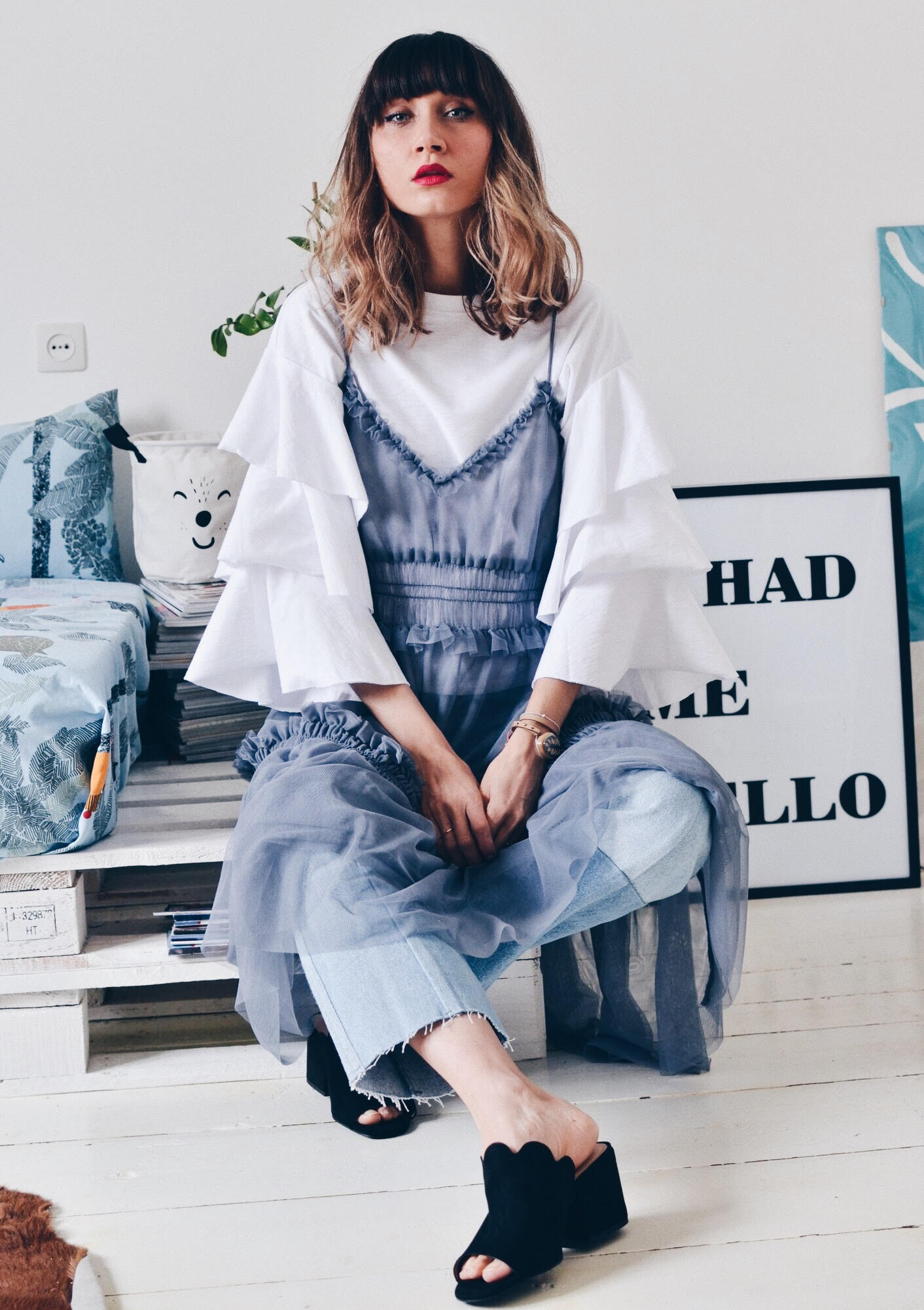 Haljinu sam odlučila spojiti s trapericama visokog struka i s ovom prekrasnom bijelom pamučnom majicom s volanima na rukavima, a sve sam upotpunila crnim natikačama koje će sasvim sigurno biti veliki hit nadolazeće tople sezone.