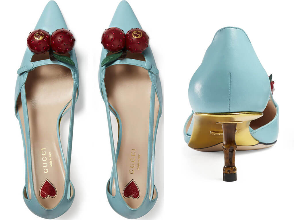 Gucci bamboo cherry pumps are my latest obsession. These low heel pumps with bamboo effect kitty heel have a statement embellishment on the toe – three-dimensional cherries with encrusted crystals.
